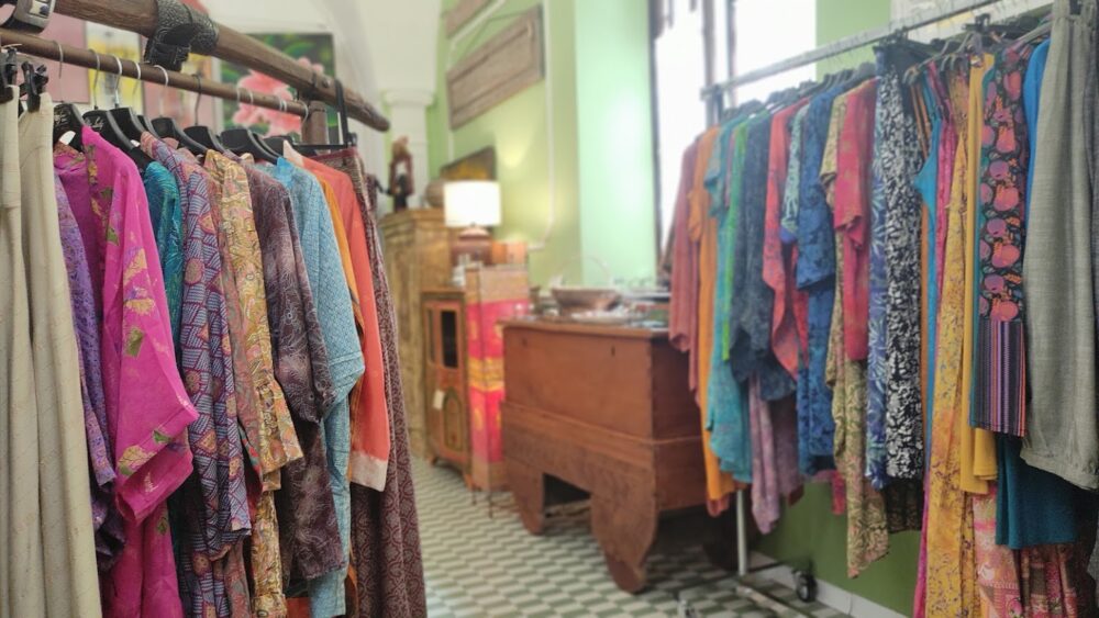 Sotto le dita, la texture morbida degli abiti confezionati sartorialmente in India e Indonesia racconta una cura che non si vede, ma si sente. Le cuciture irregolari, la consistenza di un tessuto batik ti parlano di mani che hanno lavorato con lentezza e passione.