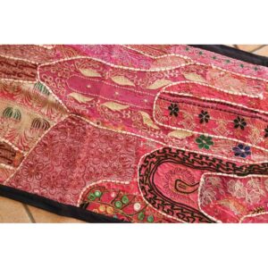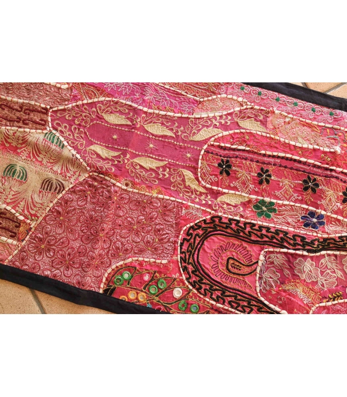 [ Patchwork di tessuti tradizionali ] Questo arazzo indiano è un patchwork di tessuti tradizionali dagli accesi color rosa e fucsia con tanti fiori ricamati di diversi colori, perline e paillettes. Spiccano i ricami bianchi ed argentati.