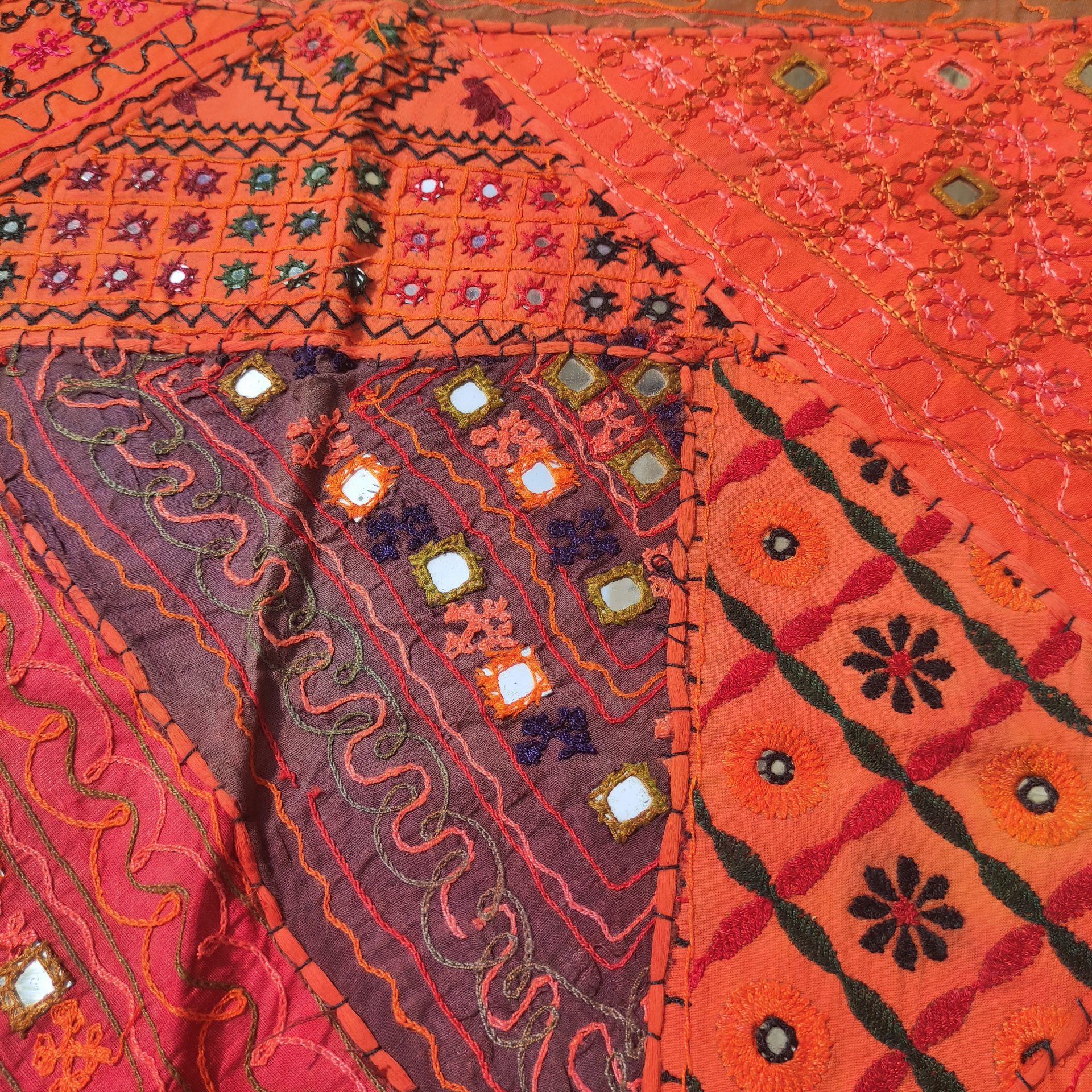 [ Ricamato con specchietti ] Questo arazzo indiano è soprattutto a tema astratto geometrico con motivi e disegni che riprendono quelli della tradizione. Su un supporto in stoffa sono applicati parti di tessuto ricamate con motivi lineari tutti diversi e creati con specchietti. Sono Inoltre presenti ricami color rosso, bordeaux, viola e arancio. In questo ci sono tanti specchietti cuciti sulla stoffa, tecnica che utilizzata anche sui vestiti e sulle nostre borse.