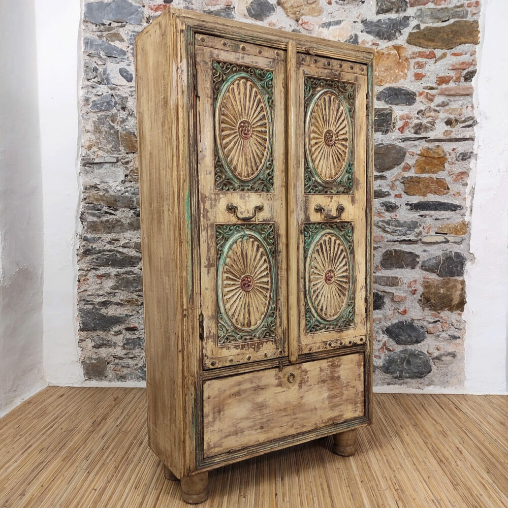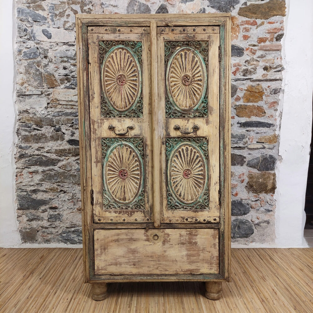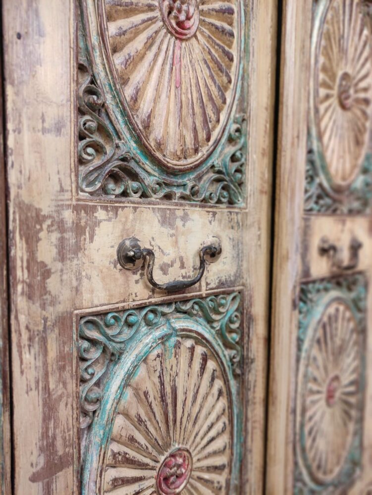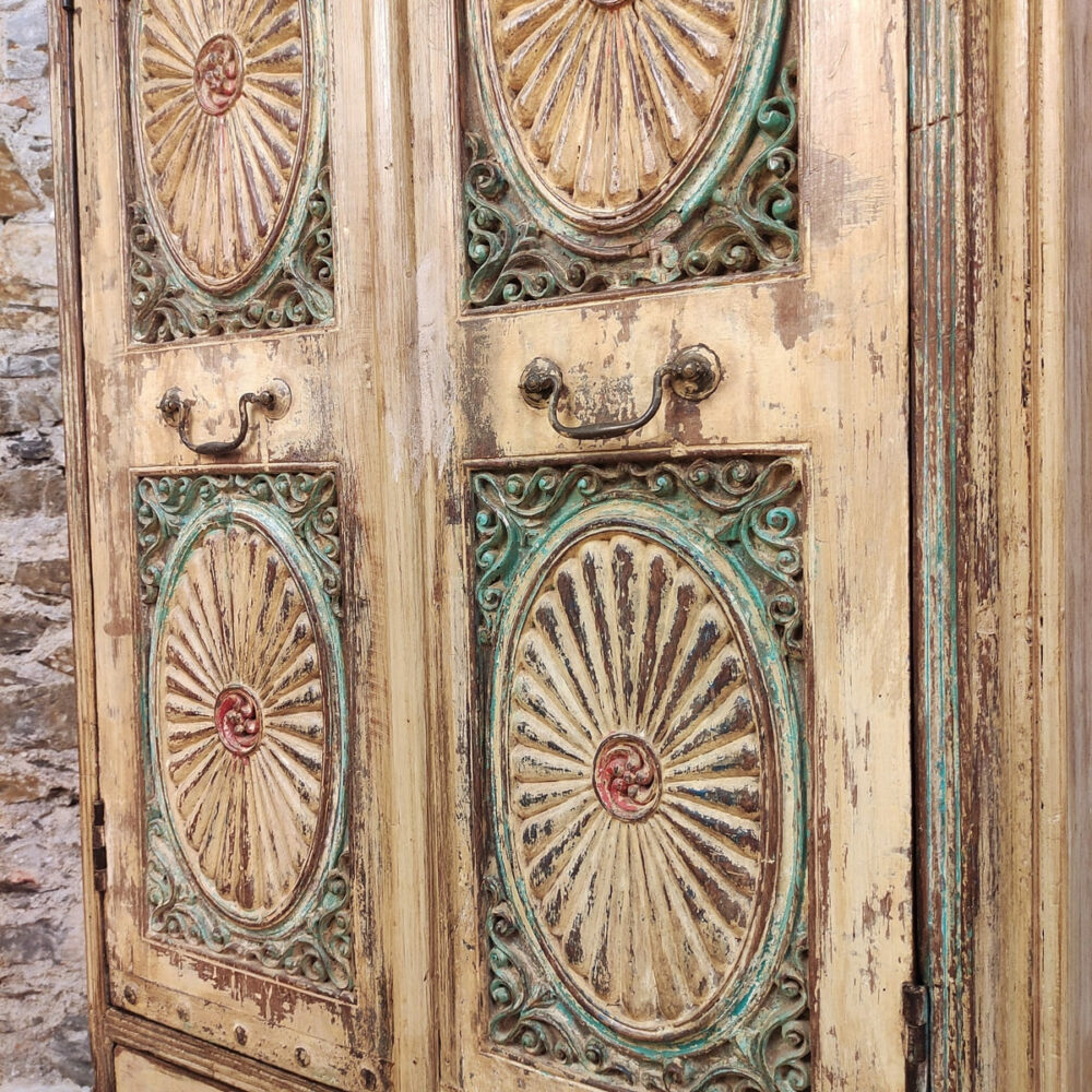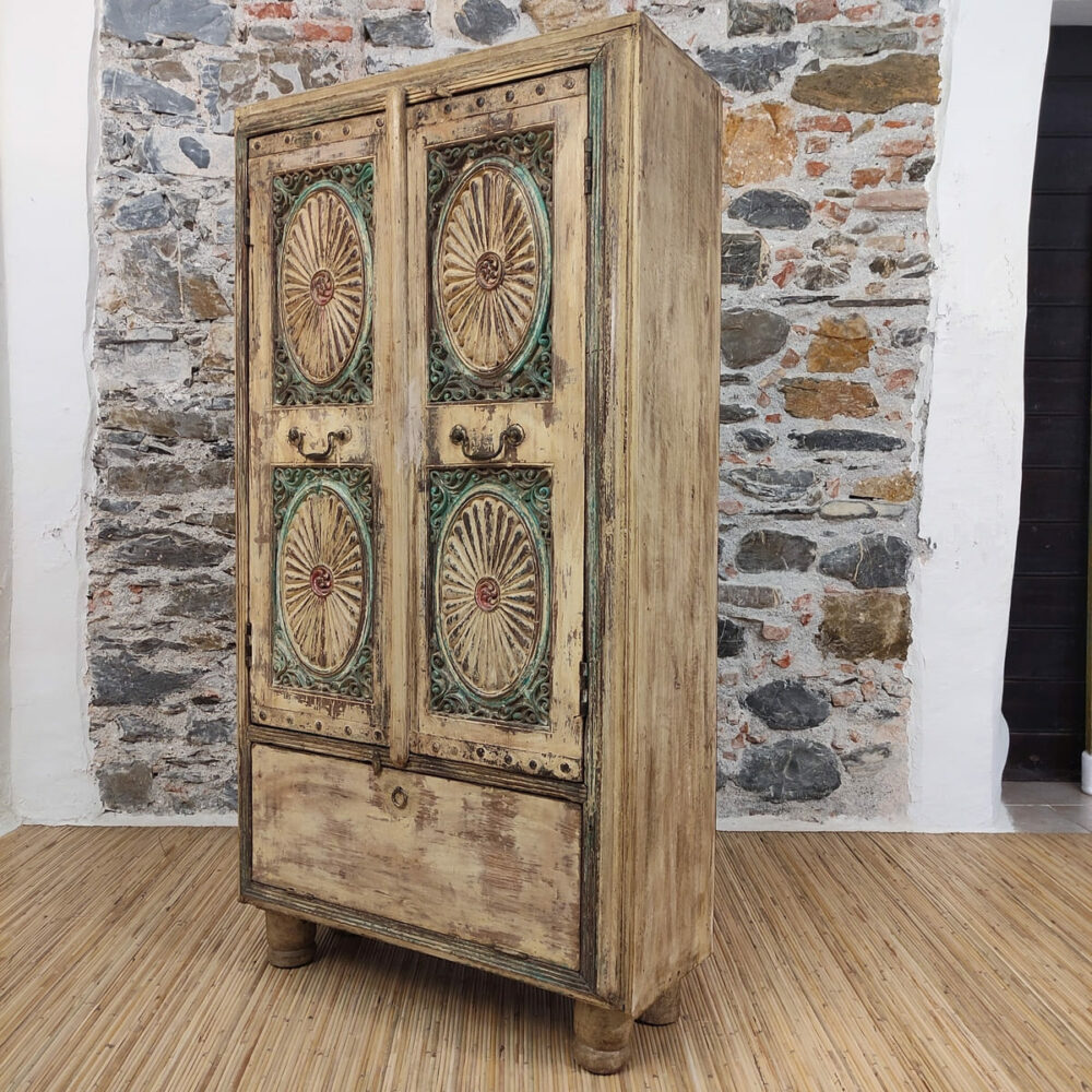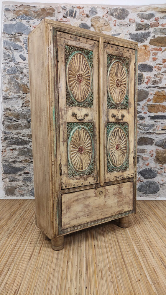 Realizzato interamente in legno massiccio, questo armadietto decorato ha una storia particolare: proveniente dal Rajasthan, nasce come mobile da incasso, era cioè inserito nel muro.