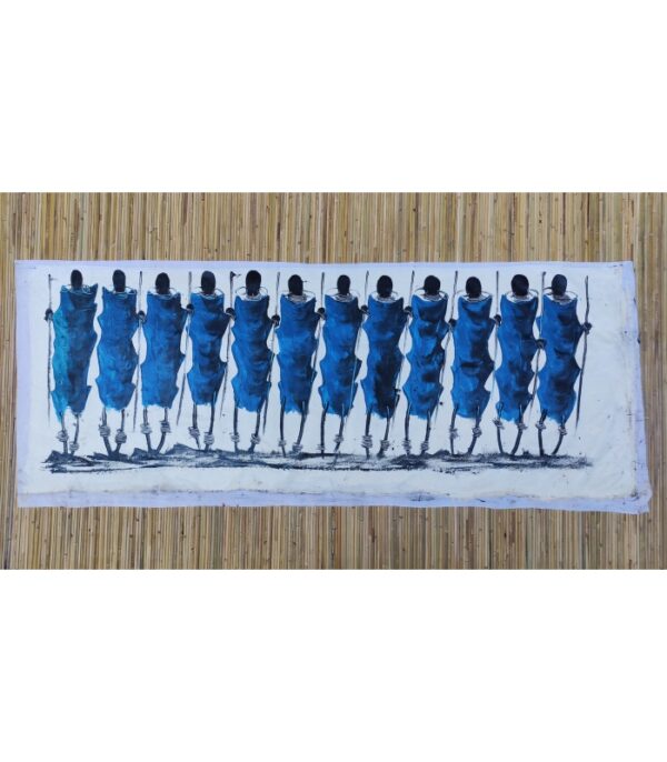 Dipinto ad olio su tela raffigurante guerrieri Masai