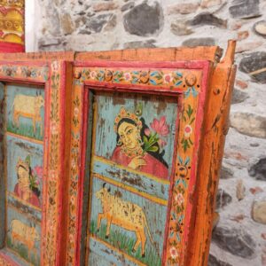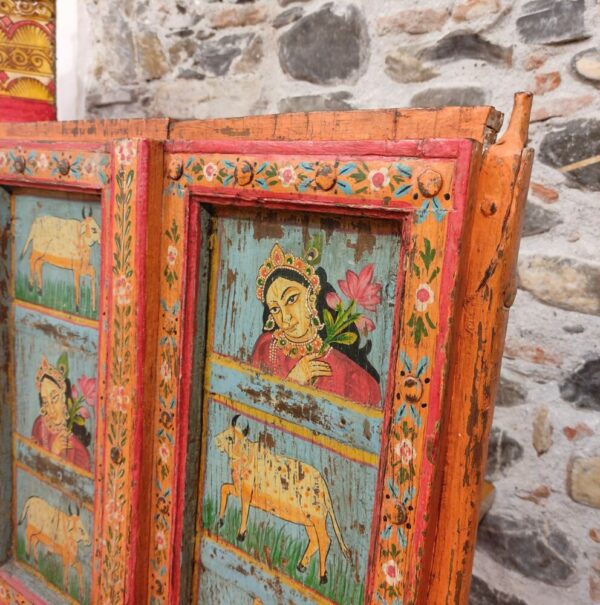 Decorata a mano Questa finestra è stata successivamente decorata a mano sui toni del rosso e dell’azzurro e vi sono stati dipinti volti femminili, fiori di loto e Nandi, la vacca sacra di Shiva. Da una semplice finestra è nata una colorata opera d’arte.