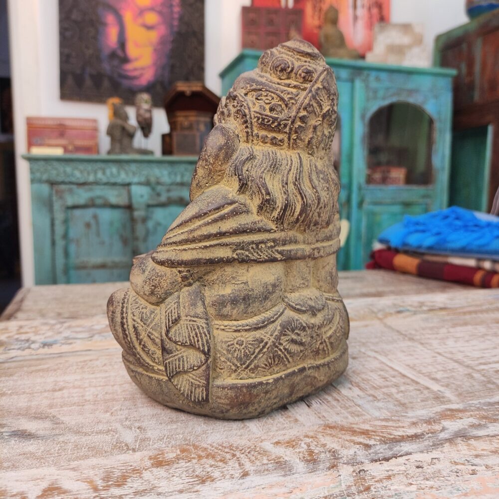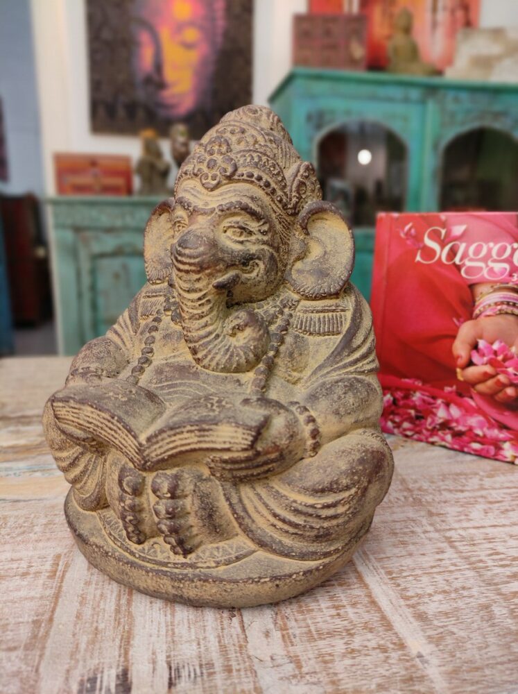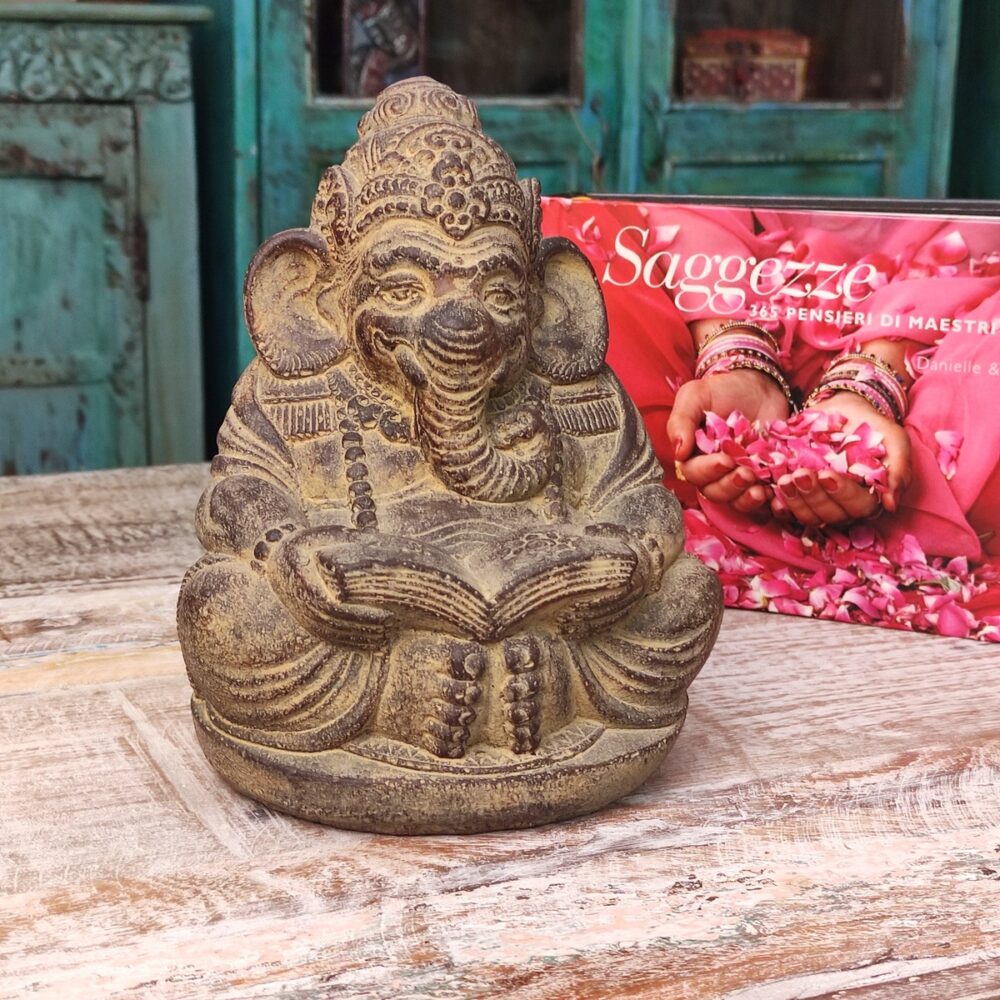 Caratteristiche della Statua di Ganesh in pietra con libro aperto sulle ginocchia