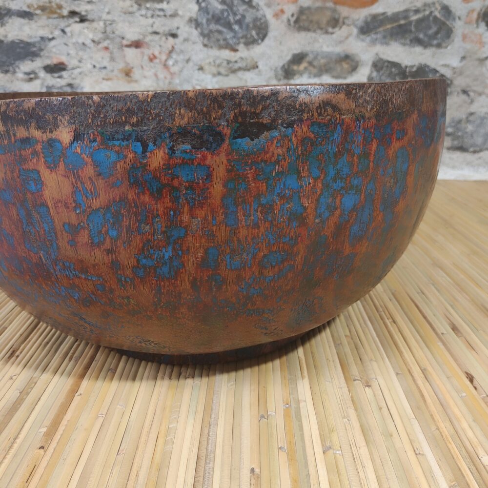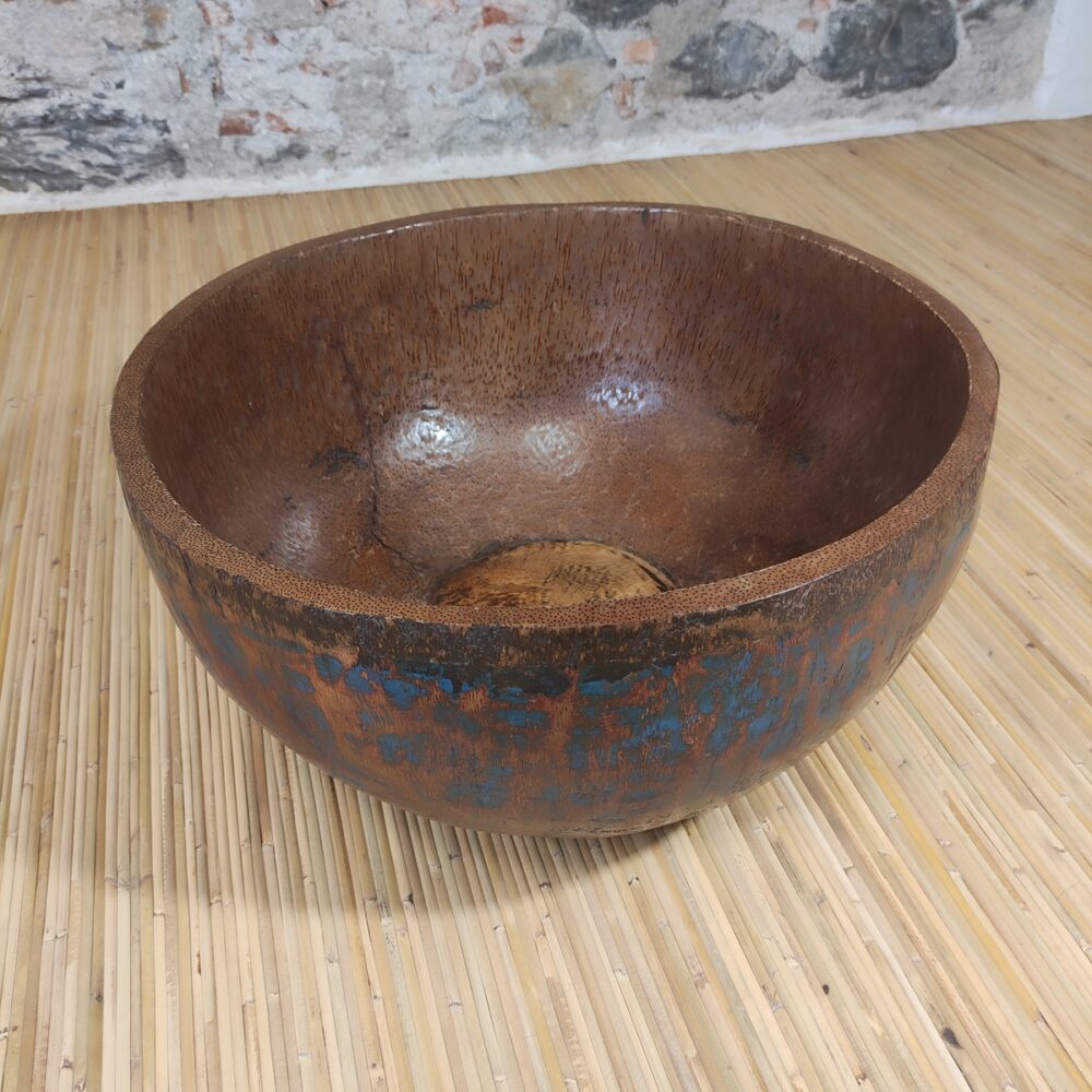 Grande ciotola decorativa dipinta con pennellate di blu. Per la creazione di questo complemento d’arredo curioso e autentico, è stato scavato e lavorato un pezzo di tronco di palma. Ideale come portaoggetti o per inventare composizioni per abbellire la propria casa.