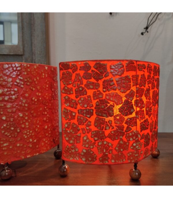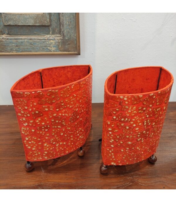 SET DI DUE LAMPADE REALIZZATE IN TESSUTO DI COLORE ARANCIONE CON PARTICOLARE DECORAZIONE A “GUSCIO D’ UOVO” PERFETTE COME ABAT JOUR DA COMODINO