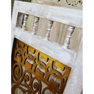 BELLISSIMO PARAVENTO SEPARE’ IN LEGNO FATTO A MANO COMPOSTO DA TRE PANNELLI IN COLORE BIANCO E ORO, INTAGLIATO A MANO