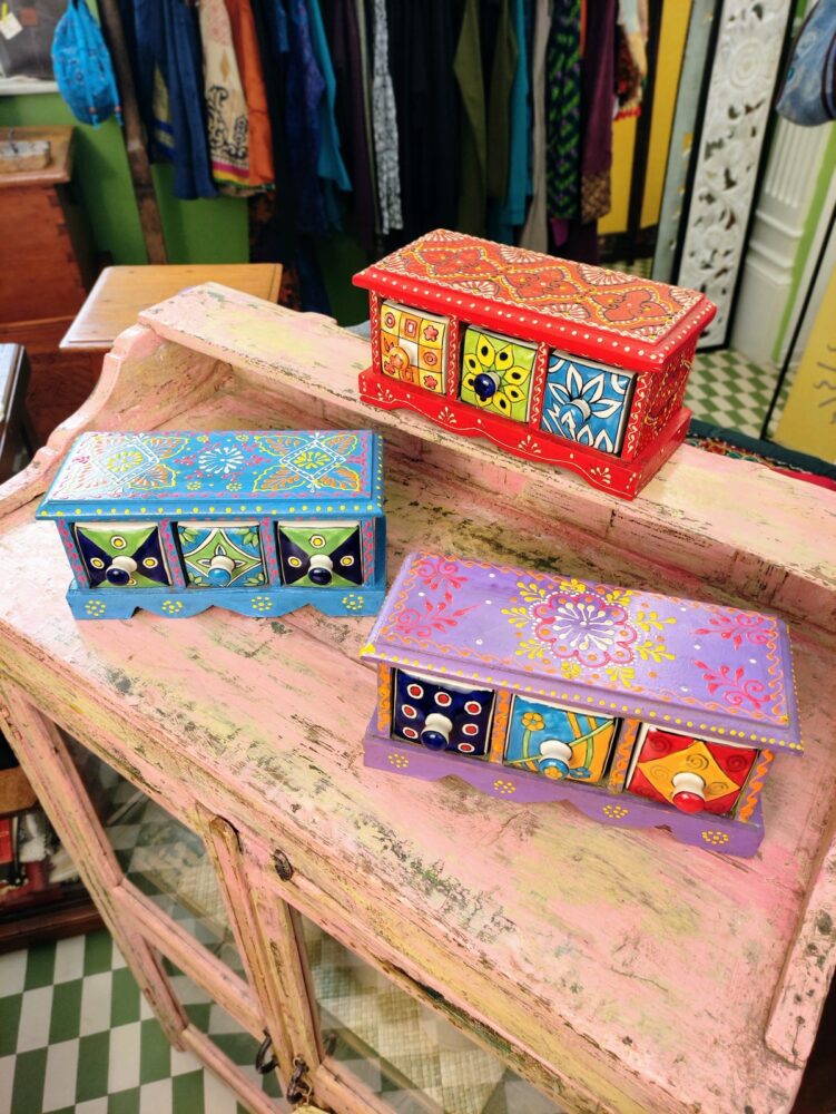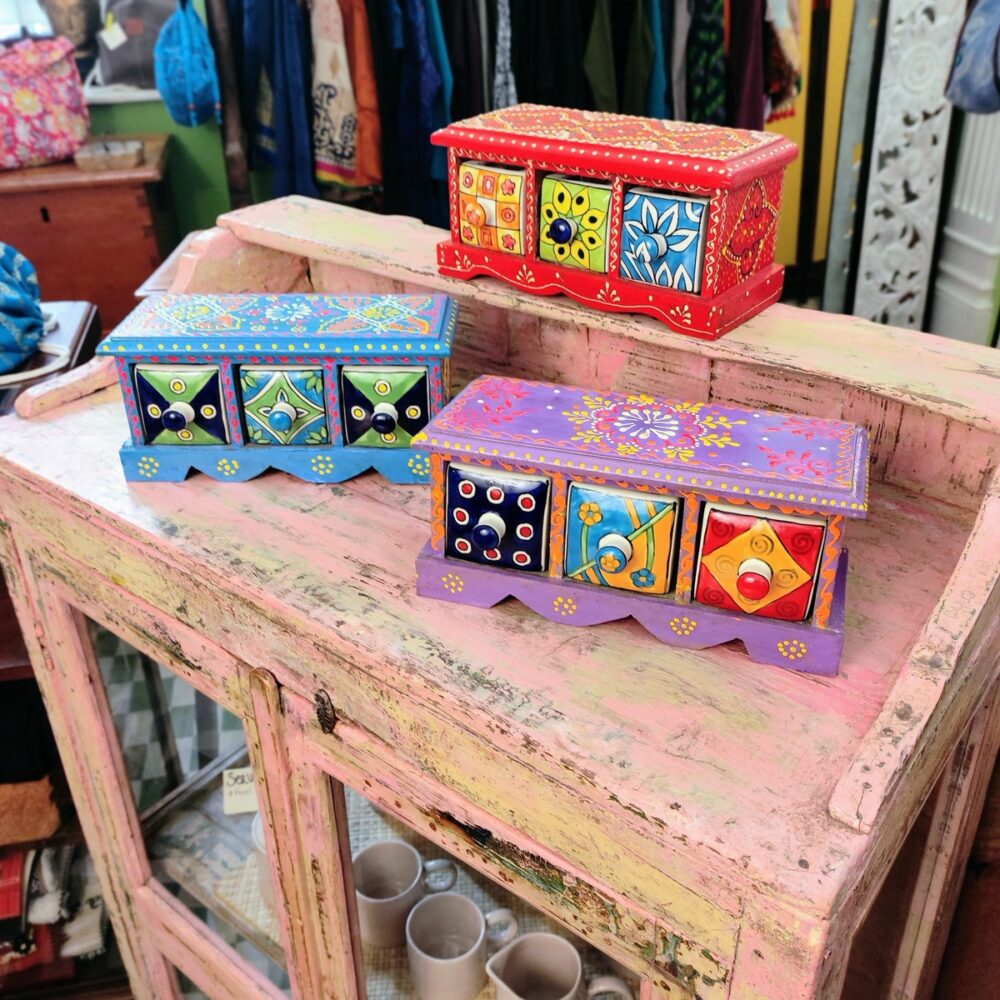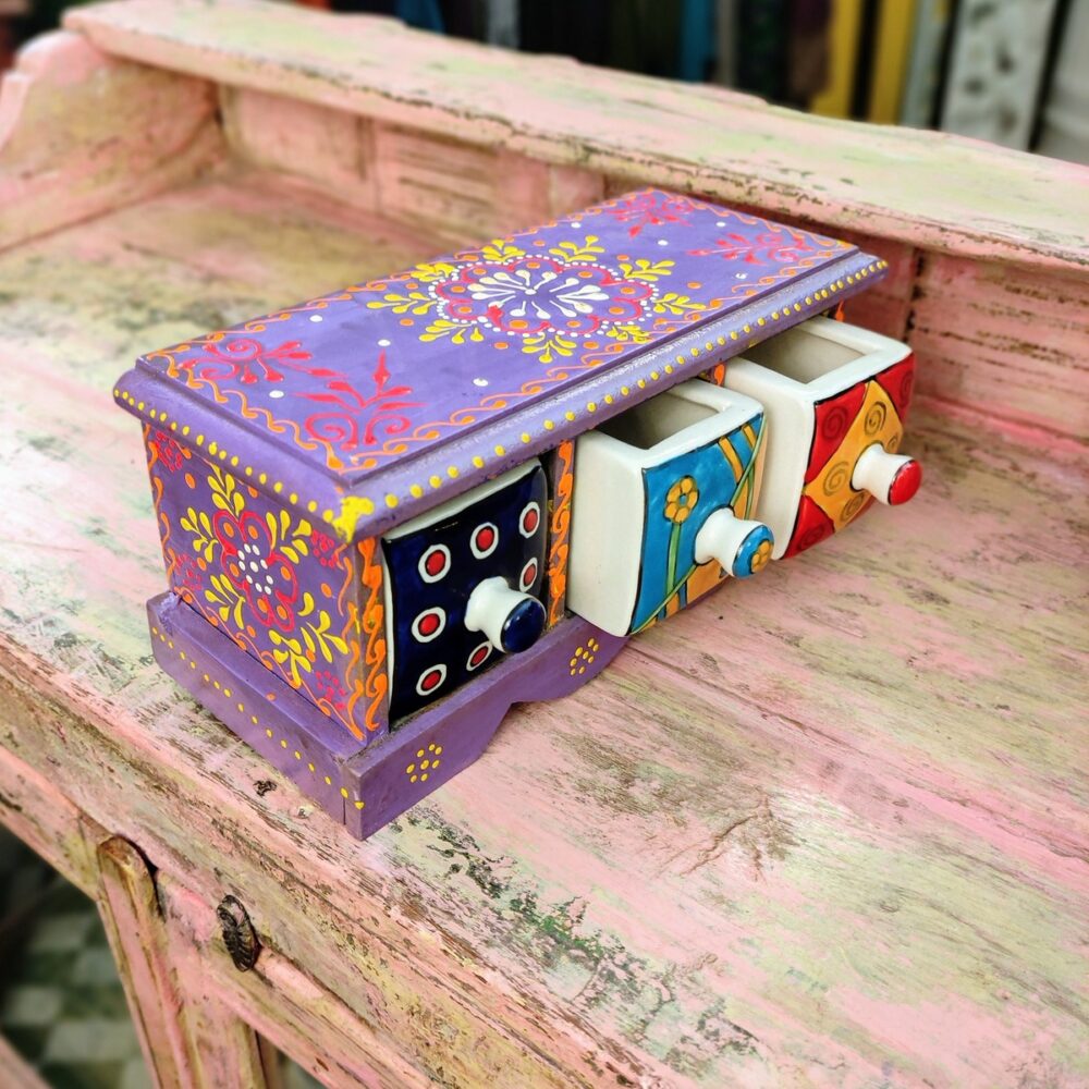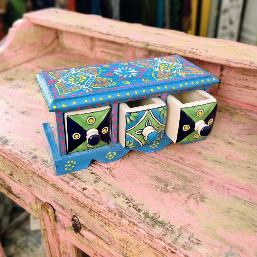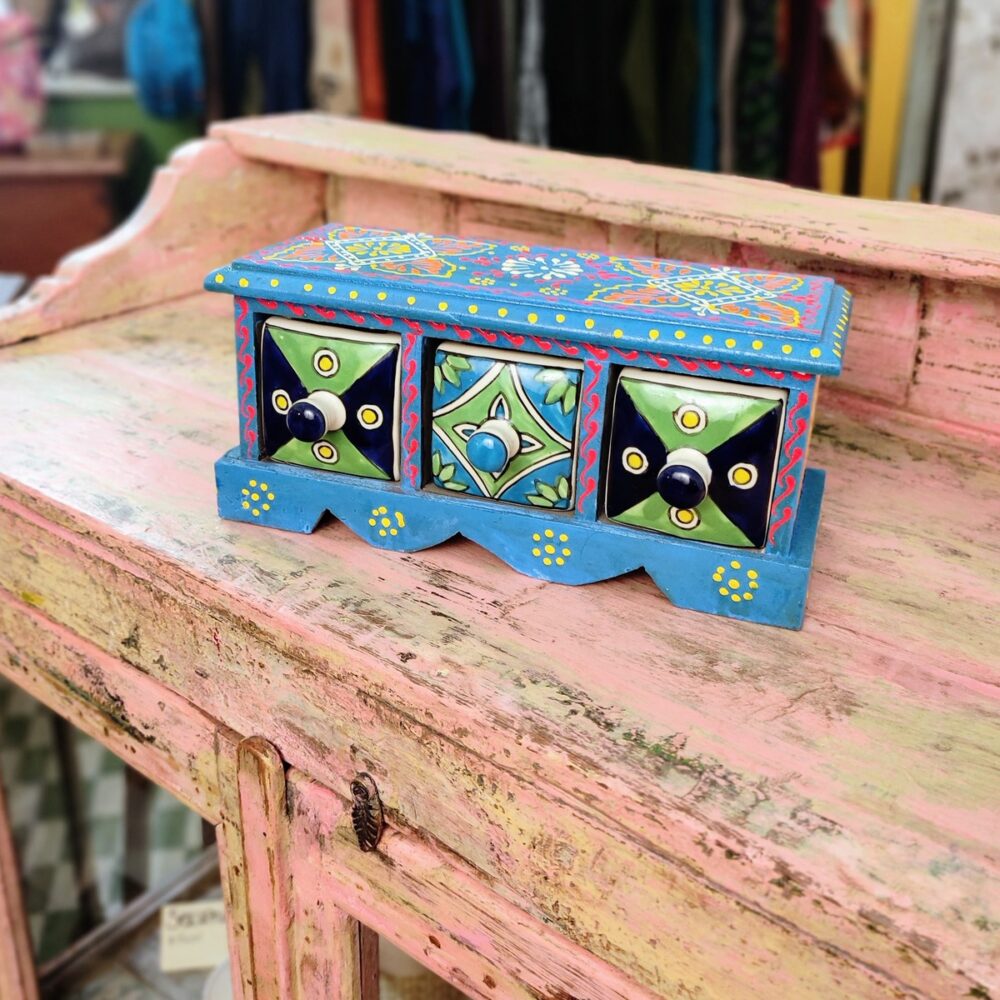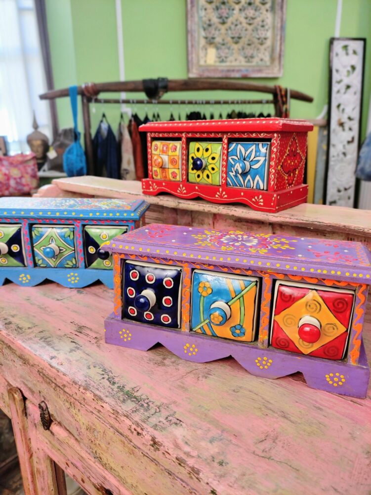 Queste piccole cassettiere da tavolo a tre cassetti completano la nostra proposta di bauletti & portagioie indiani e sicuramente porteranno quel tocco di colore e vivacità in ogni spazio nel quale verranno utilizzate.