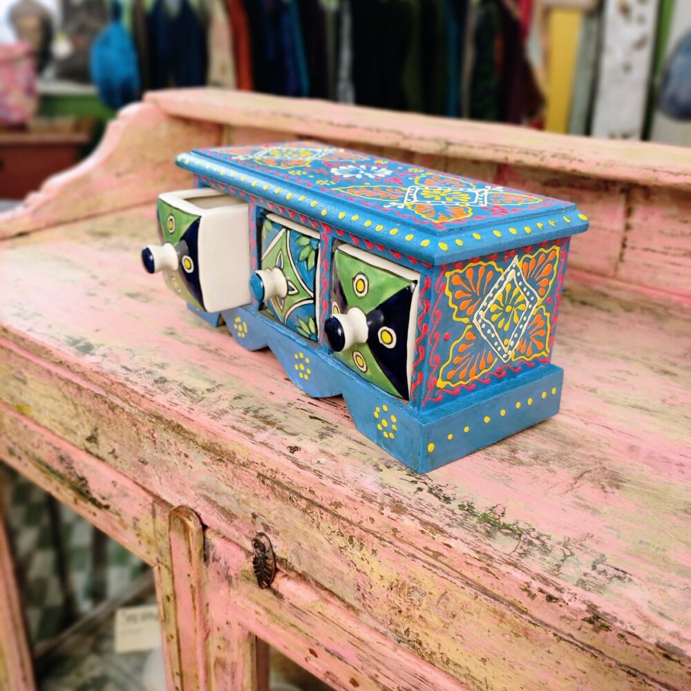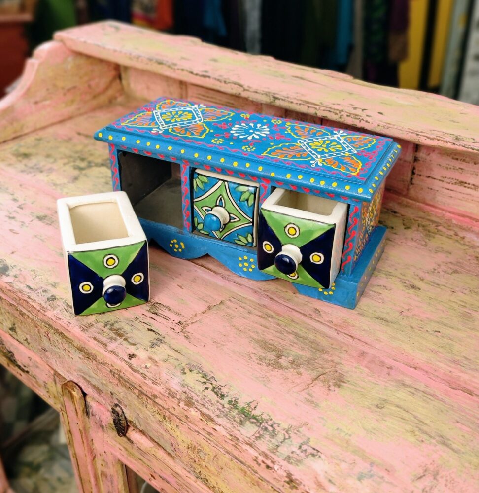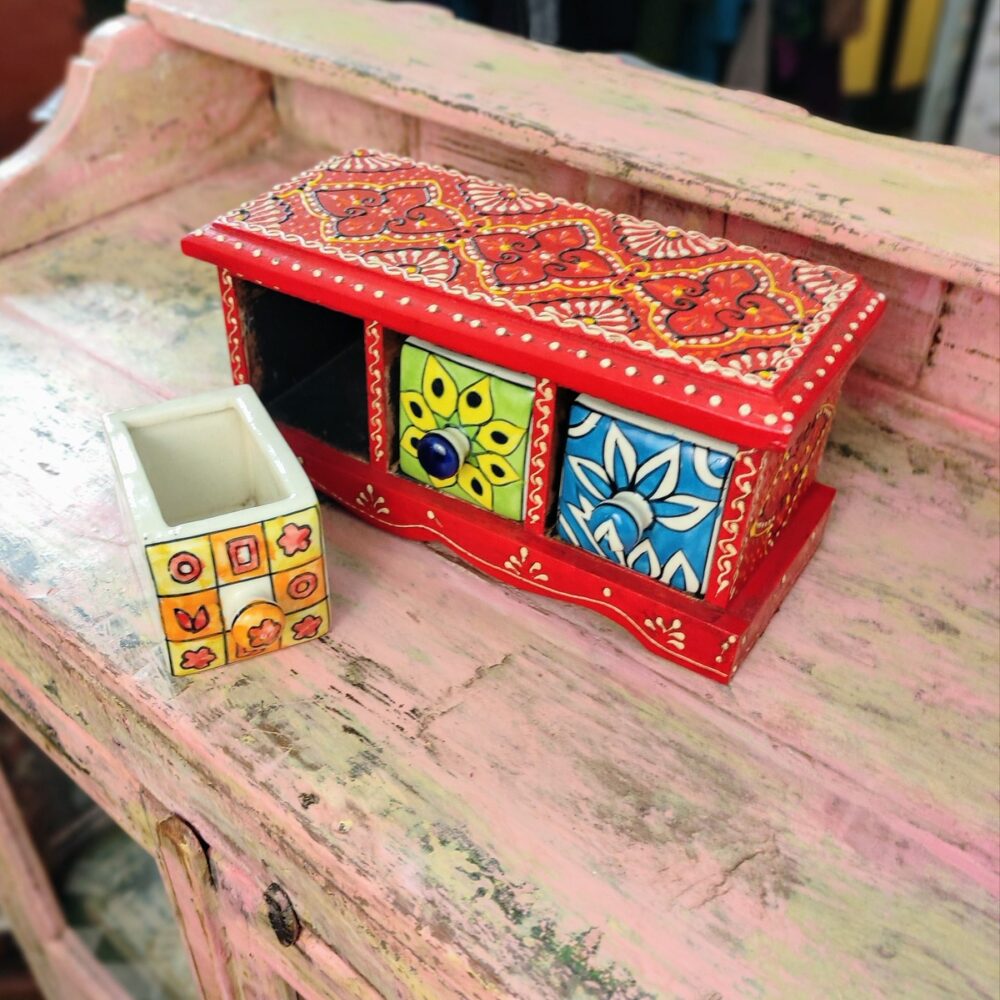 Queste piccole cassettiere da tavolo porta oggetti, sono un grazioso e coloratissimo prodotto d’artigianato indiano. La struttura è realizzata in legno ed i tre cassetti con pomello sono in ceramica.