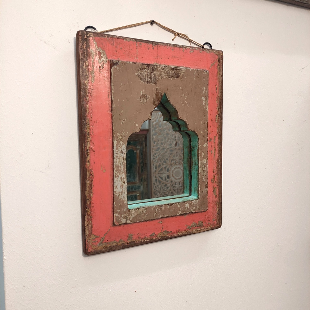 Lo specchio decorato indiano si caratterizza per la forma e per il mix di colori ma porta in sé una storia più lunga. Il legno con cui è realizzato proviene da una vecchia porta o finestra.