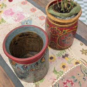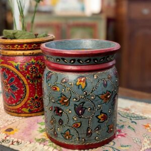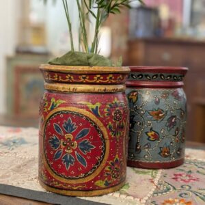 Il portavaso dipinto a fiori indiano è una piccola fioriera in legno ideale da aggiungere alla tua casa. Decorato con motivi floreali dagli artigiani del Rajasthan (India del nord) porta con sé l’eleganza dei colori e delle decorazioni indiane unita al fascino rustico e autentico degli oggetti in legno realizzati a mano.