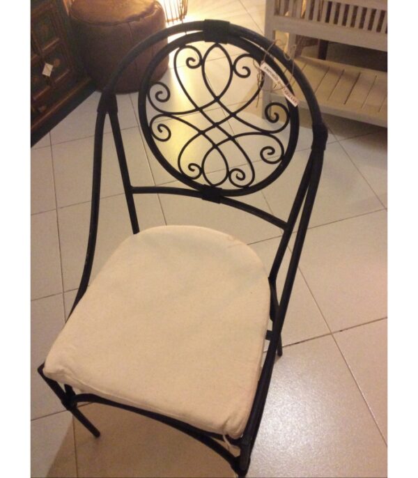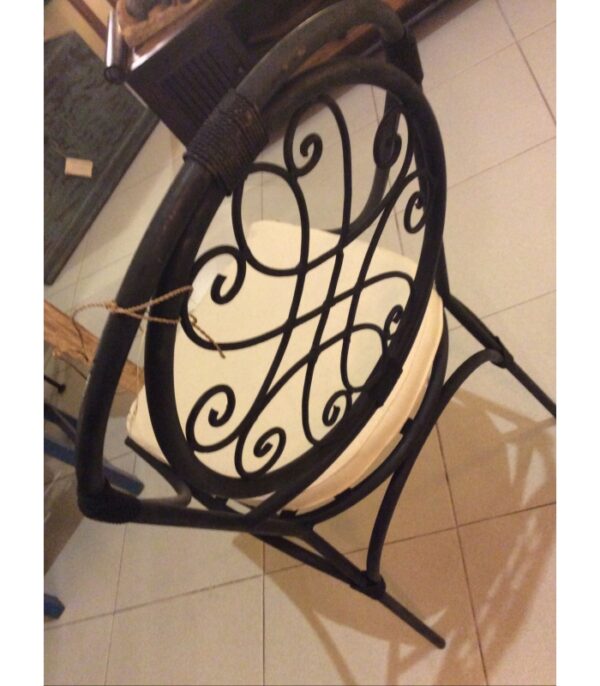 Sedia in ferro battuto fatta a mano con cuscino bianco in cotone grezzo.