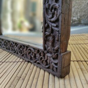 La caratteristica che fa di questo specchio un complemento unico, è l’origine della cornice: realizzata con antichi fregi in legno massiccio provenienti da una vecchia dimora indiana del Rajasthan.