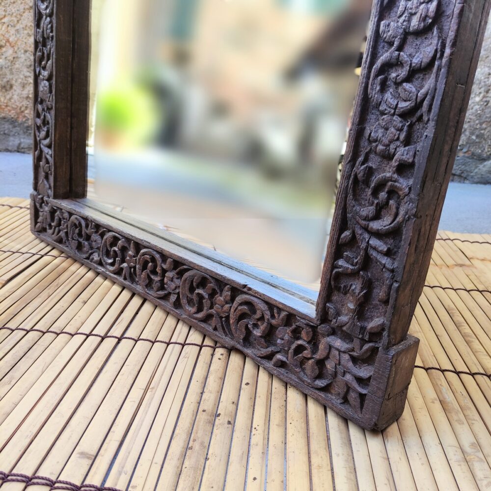 L’antica decorazione intagliata e il colore scuro del legno, conferiscono a questo specchio decorativo indiano, la capacità di donare un tocco etnico e di charme allo spazio in cui verrà posizionato.