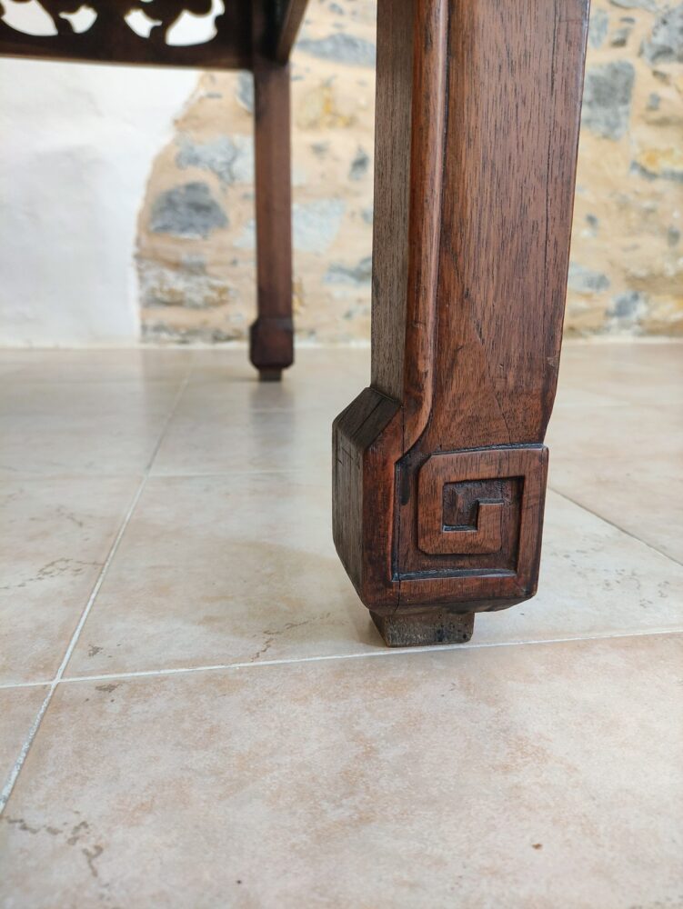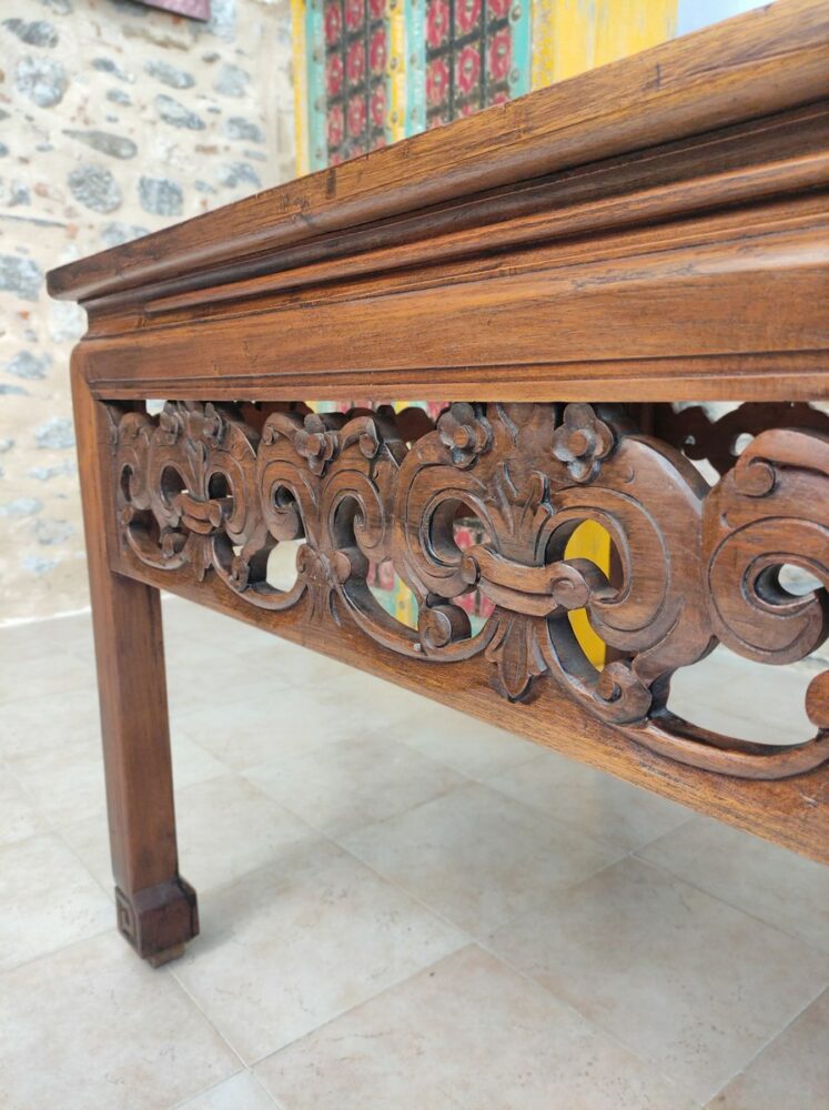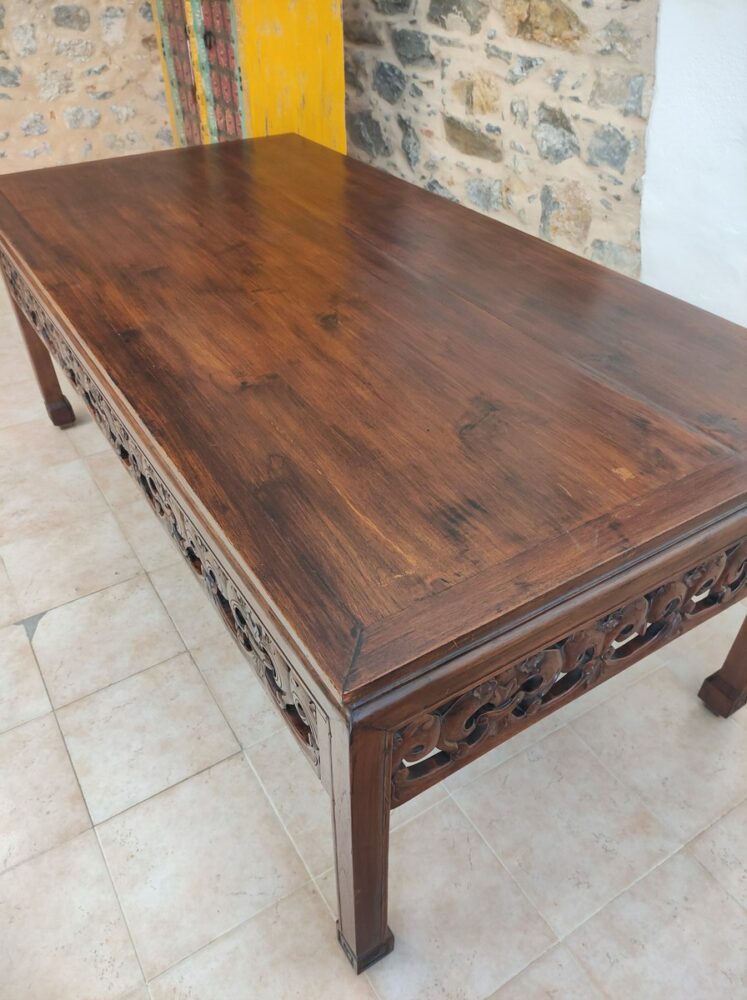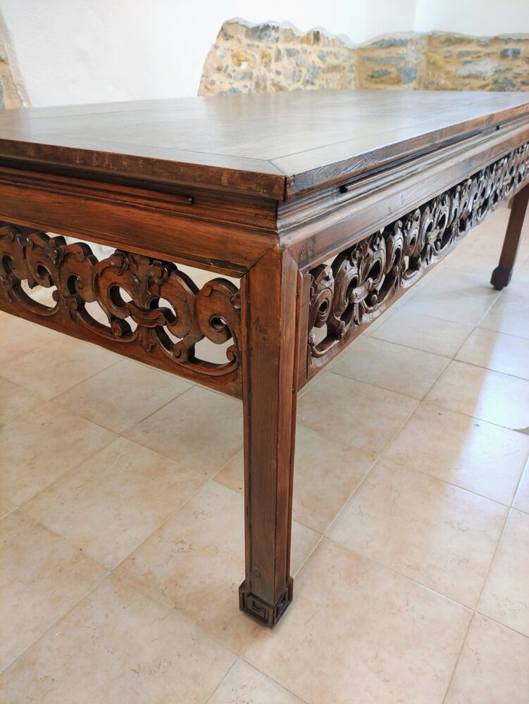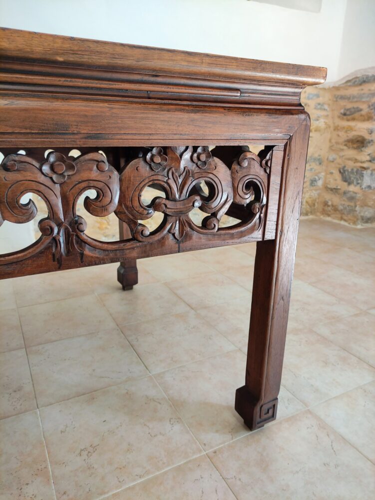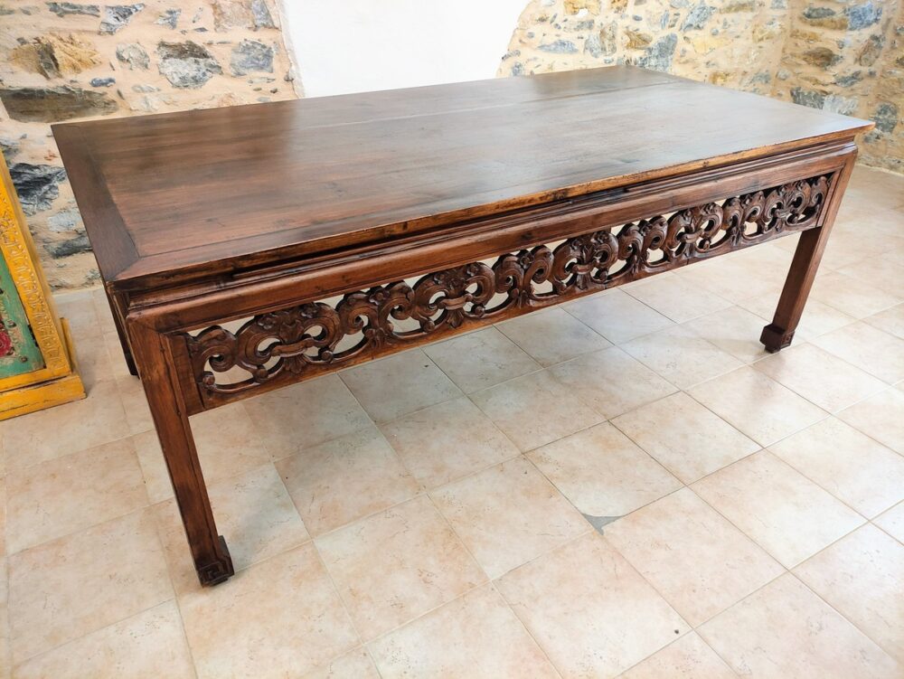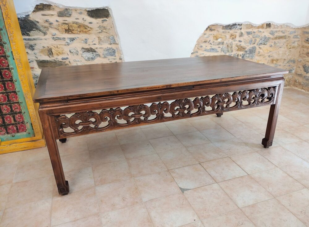 Antico tavolo da lavoro recuperato e ristrutturato, proveniente da una sartoria. il tavolo, realizzato artigianalmente e ricco di decorazione intagliate, coniuga un’anima pratica da lavoro all’eleganza dello stile asiatico.
